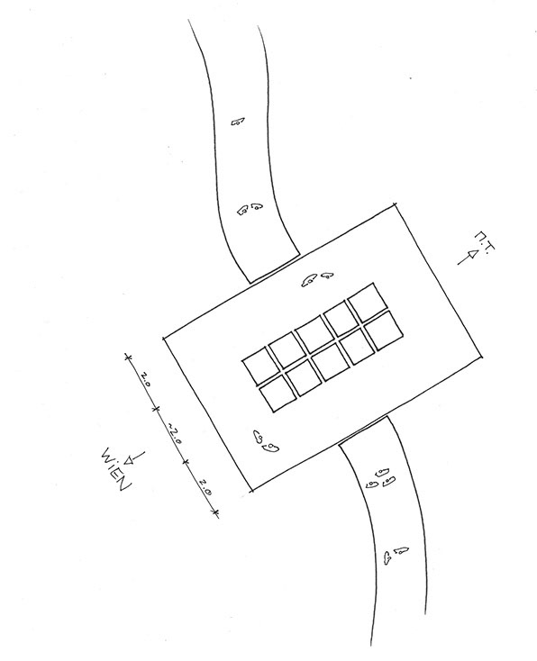 Aus der Ferne ist ein Stein zu sehen, ein monolithisches Ganzes. Je näher man ihm kommt, umso deutlicher werden Details und Fragmente - ähnlich einer historischen Annäherung. Keine Seite dieses auf den ersten Blick homogenen Massivs ist besonders hervorgehoben. Egal, von wo man sich ihm nähert - sei es auf den Wegen oder über die Wiesen - die Geschichte bleibt die Selbe.Der leicht geschwungene Weg durch die Landschaft wird jedoch durch dieses Massiv jäh unterbrochen. Der Besucher wird auf seiner Route bewusst gebremst. Der Stein selbst versperrt den Pfad zum einen rein optisch, zum anderen als physische Barriere. Ein Wechsel des Bodenbelages vom Weg zum Fundament des Massivs erzeugt eine Schwelle und definiert einen klar gefassten Raum. Der Besucher betritt bewusst ein gefasstes Geviert in diesem großen Areal, das einzig den österreichischen Opfern gewidmet ist. Ein einfaches „Vorbeiflanieren“ ist nicht möglich und verlangt nach einer Auseinandersetzung mit dem Ort und seiner Geschichte. Die Ausrichtung und die Stellung des Steins verbinden Wien und Maly Trostinec und transloziert so die Richtung der Transporte ins Heute.