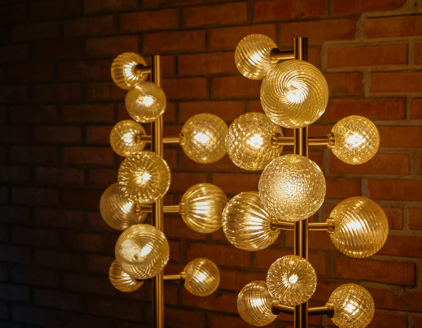 Stehleuchte aus poliertem Messingrohren und Kugeln aus Muranoglas - für eine Wiener Hotellobby. In Zusammenarbeit mit